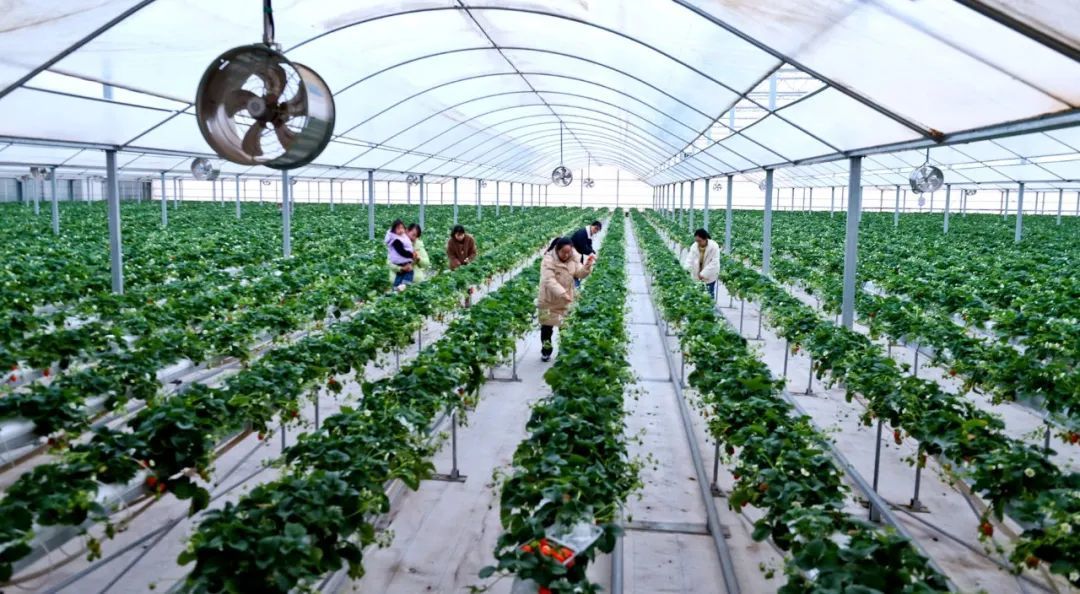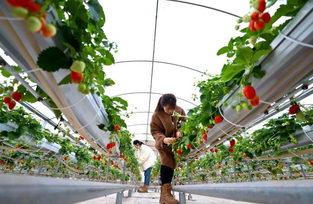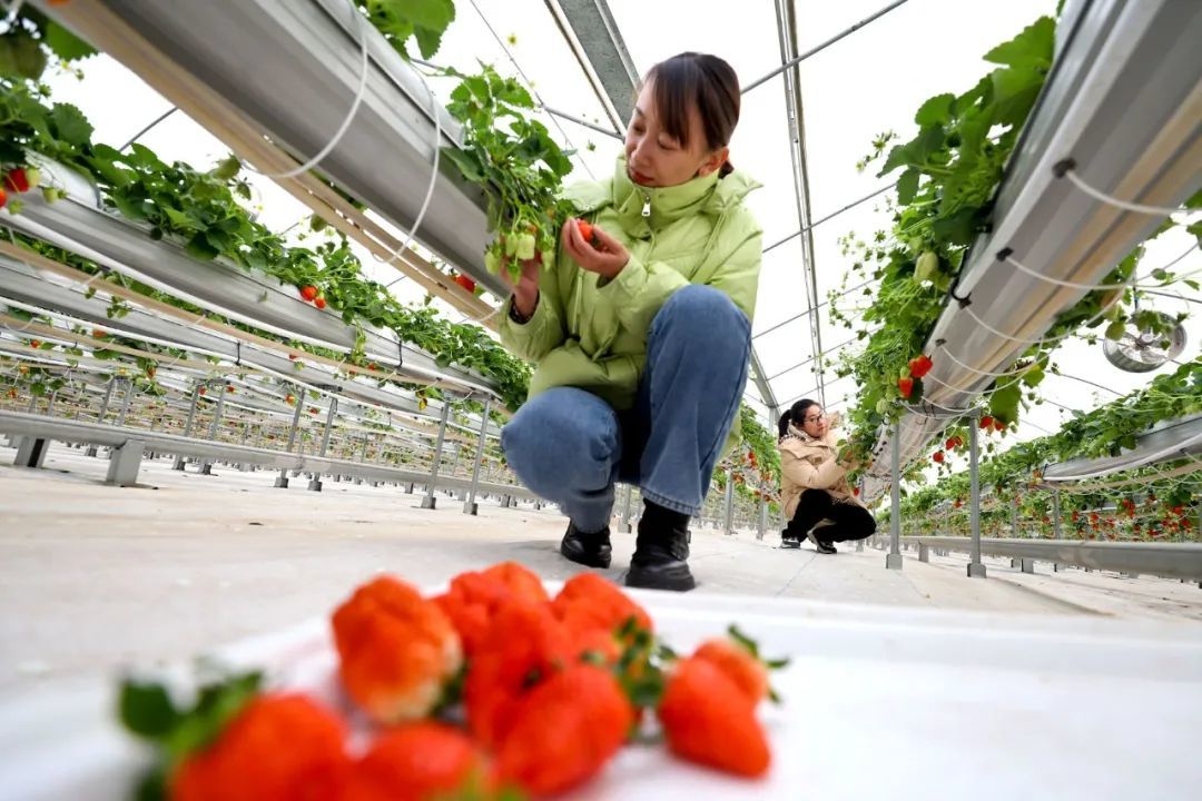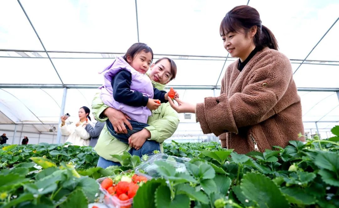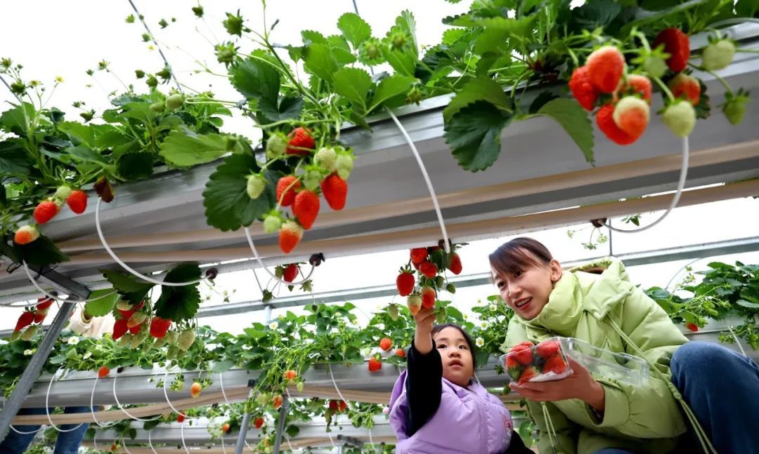 1月15日,甘州区靖安乡草莓庄园现代高效农业草莓种植大棚内,游客带着小朋友采摘草莓。