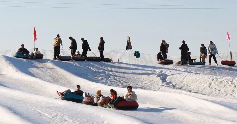 在瓜州县奇缘冰雪乐园滑雪场,大人带着孩子或在雪地中快乐嬉戏,或坐雪圈飞驰其中,脸上洋溢着快乐,洁白的雪场变成了欢乐的海洋。