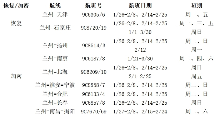 据悉,春运期间,春秋航空将恢复和加密9条航线。其中包括恢复兰州至天津9C6305/6航班,每周一、三、五运营,以及兰州至石家庄的9C8720/19航班,每周一、三、五、七运营,此外,还加密了兰州往返扬州、南京、北海、宁波、合肥、长春、揭阳等地的航班班次。以下是春运恢复和加密航线的详细信息。