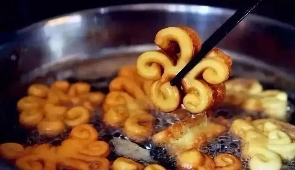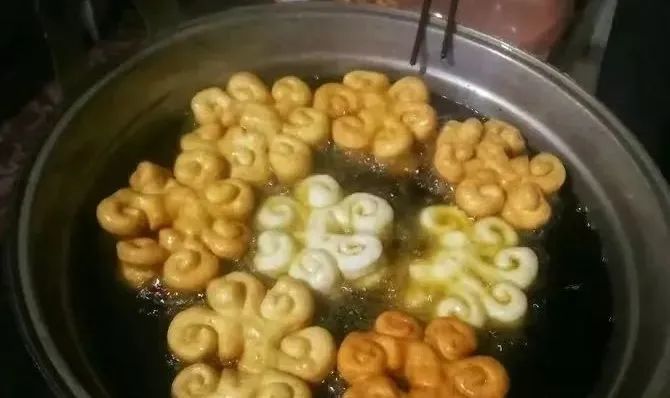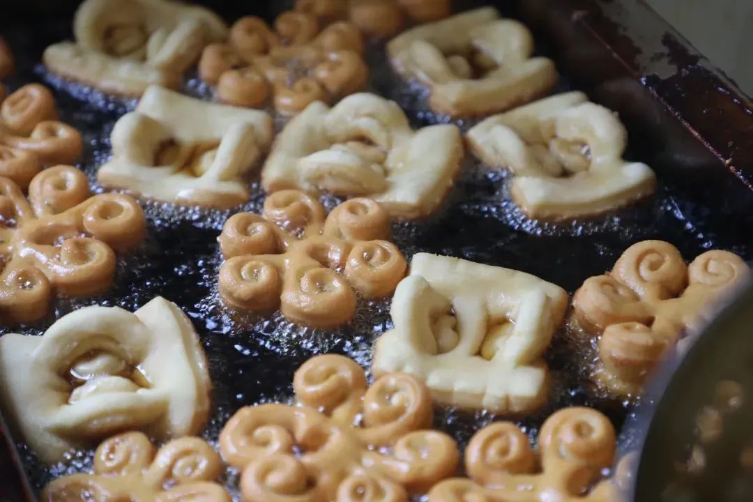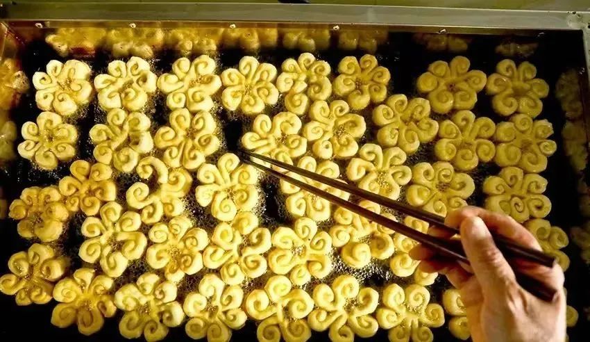 一个个金灿灿、油亮亮的油炸糖花出锅后,堆在一起的糖花像一岭金色的小山,放佛看到了来年生活的富裕和美好。
