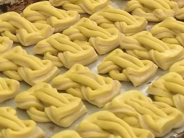 一种是烟盒大小的方形框里划出几道沟,其间藕断丝连隆起的面饼或上挑或下翻或卷曲或穿梭,从而扭结成花,那花样粗略地看,好像一个“亚”字,此“亚”字是浮雕版的,立体而丰富,油炸出来一个个金黄中透出糖的绯红。