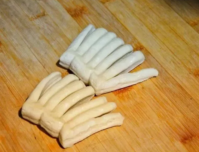 还有一种是菊花形,划出的众条沟的一端是散开着的,将一条条面畦一股脑儿紧挨着在两侧翻,翻得花边卷起来且卷得层数越多,寓意今年的日子比往年更加繁盛且绚烂。