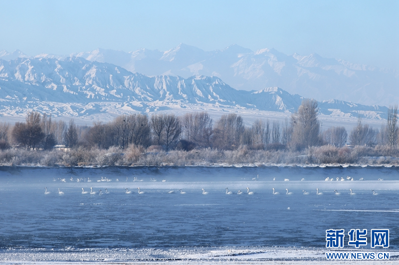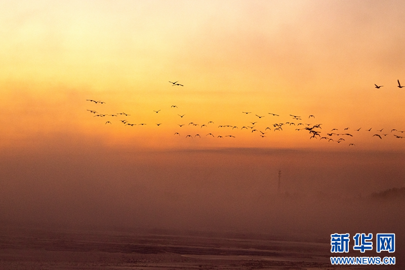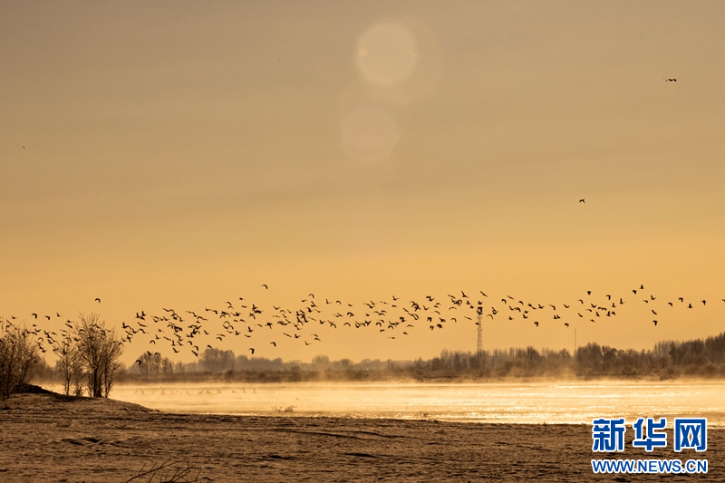 1月21日,冬日清晨,甘肃张掖黑河湿地日出如画。一轮冉冉升起的红日绚丽夺目,与河流、树木、候鸟、晨雾共同构成了一幅生态画卷。新华网发(成林 摄)