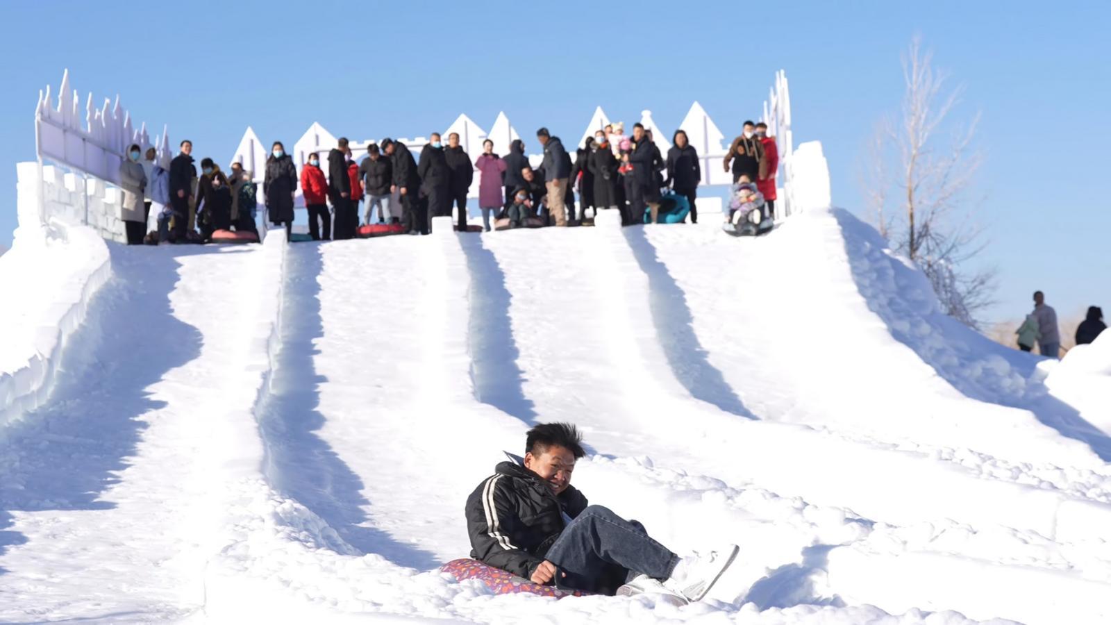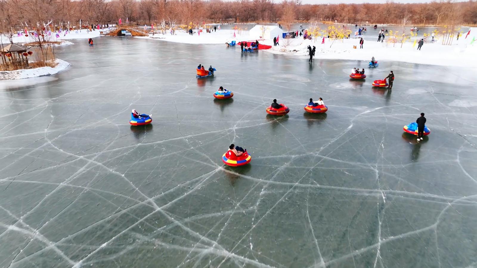 在金塔县沙漠胡杨林景区冰雪嘉年华,大人带着孩子或在雪地中快乐嬉戏,或坐雪圈飞驰其中,脸上洋溢着快乐,洁白的雪场变成了欢乐的海洋。