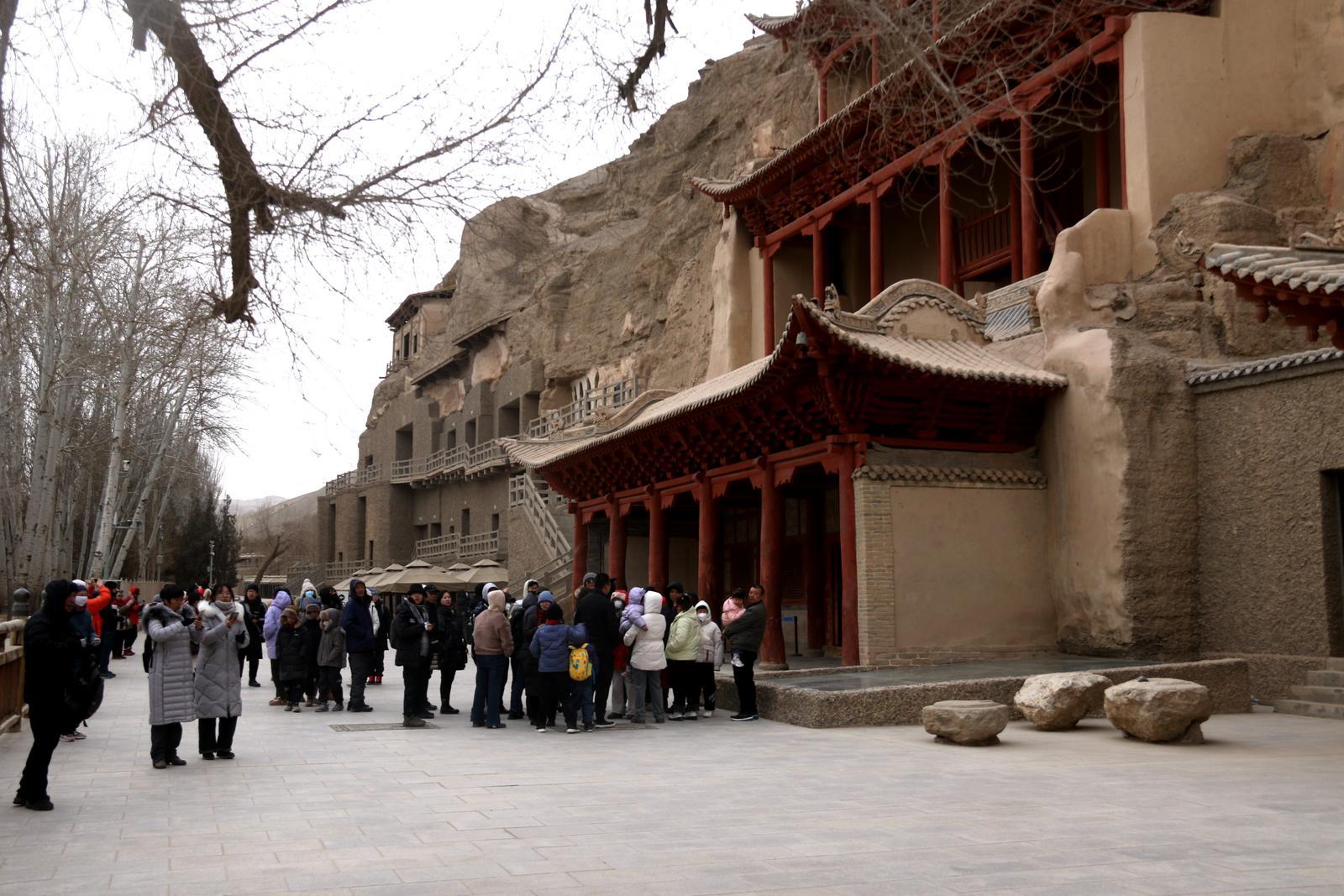 游客在世界文化遗产敦煌莫高窟参观