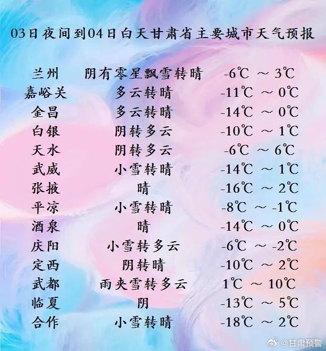 今天夜间到明天白天,定西、甘南、陇南、天水、平凉、庆阳等市州及张掖、金昌、武威三市阴有小雪或雨夹雪转多云,其中甘南、庆阳两州市及陇南市西北部局部地方有中雪;省内其余地方多云,局部地方阴有小雪。另外,3日夜间到4日清晨,全省各地气温下降3—5℃。