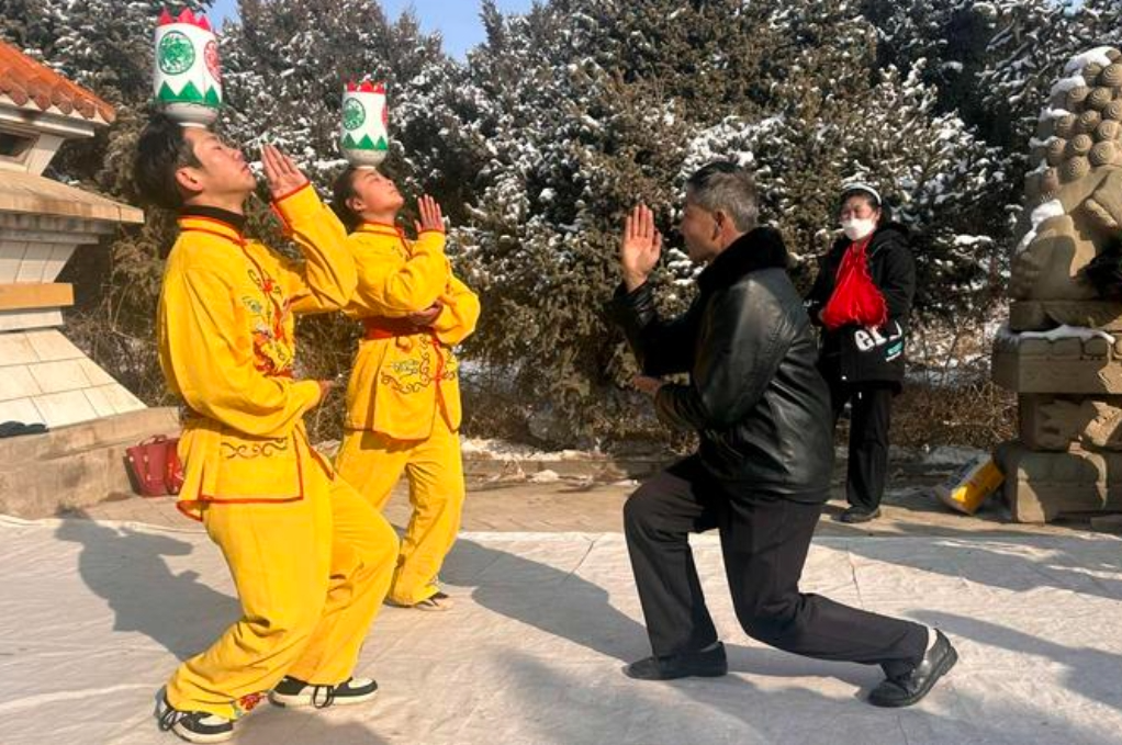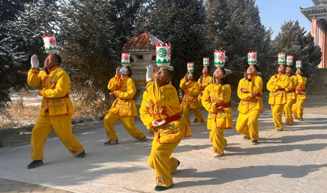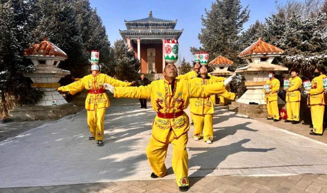春节期间,凉州区永昌镇石碑村热闹非凡,石碑滚灯班子的队员们正在表演滚灯舞。伴随着锣鼓声声,滚灯队员们头顶灯碗,模拟各种动物的形态,做翻转滚爬等一系列动作,表演幽默风趣,技巧性强,带有一定的杂技性。
