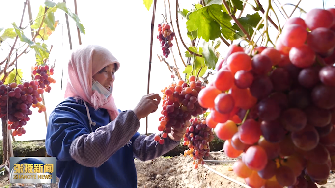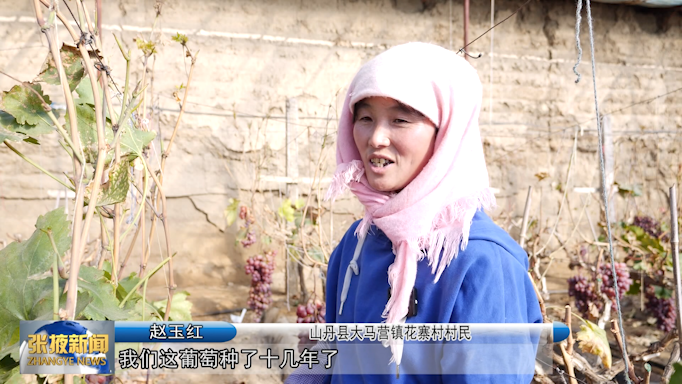 山丹县大马营镇花寨村村民 赵玉红:“我们这葡萄种了十几年了,虽然成熟得迟,但是早晚温差大,口感好,葡萄吃起来甜,价格上也好。”