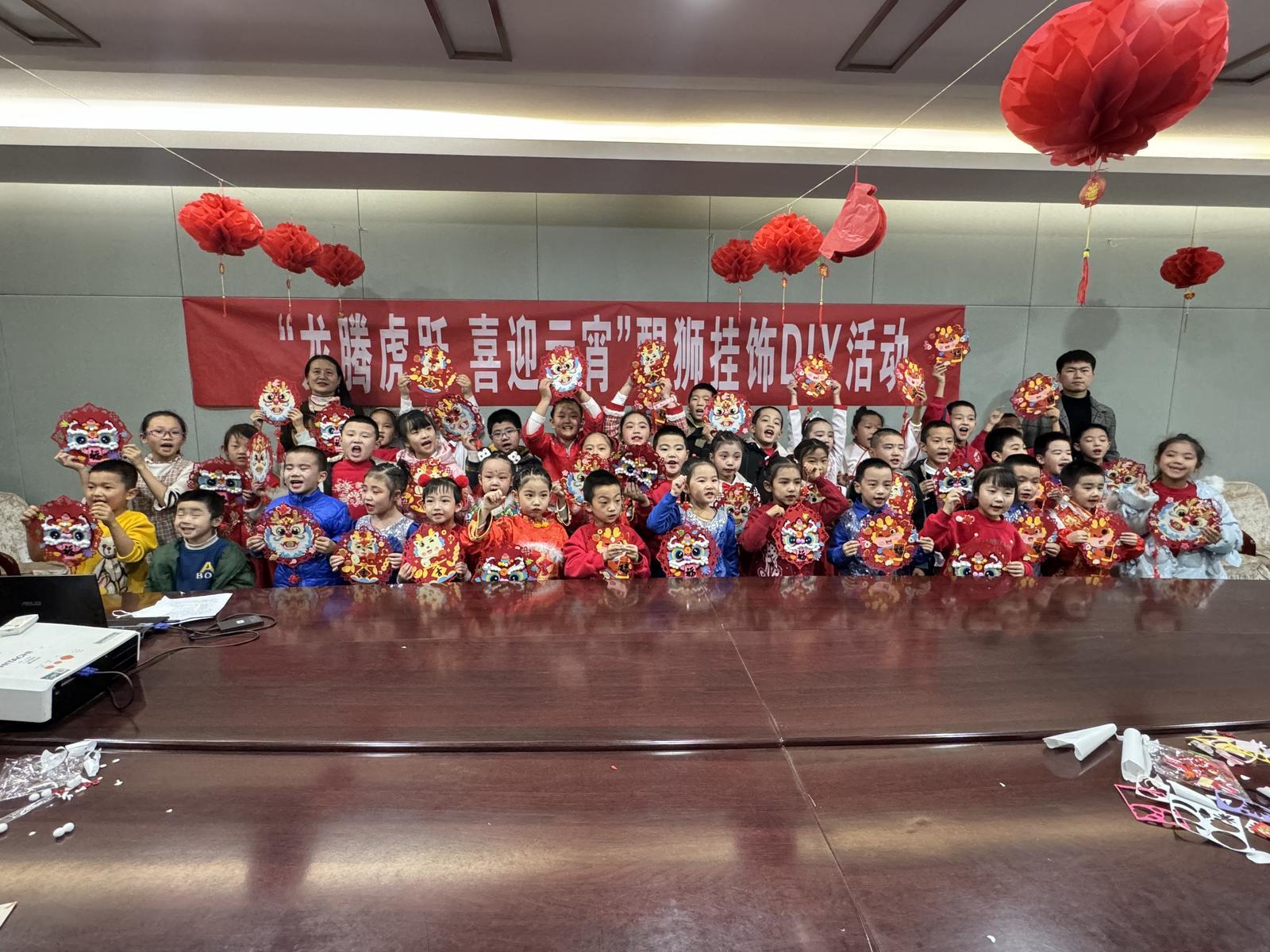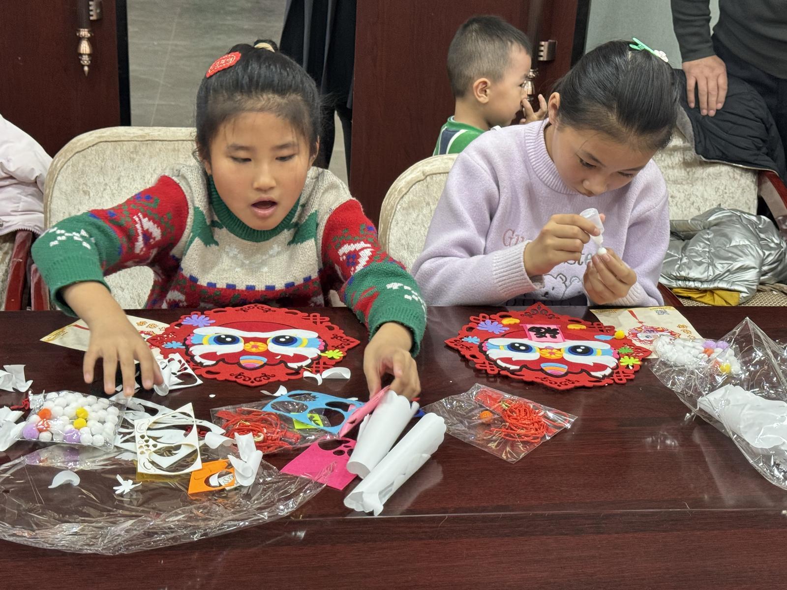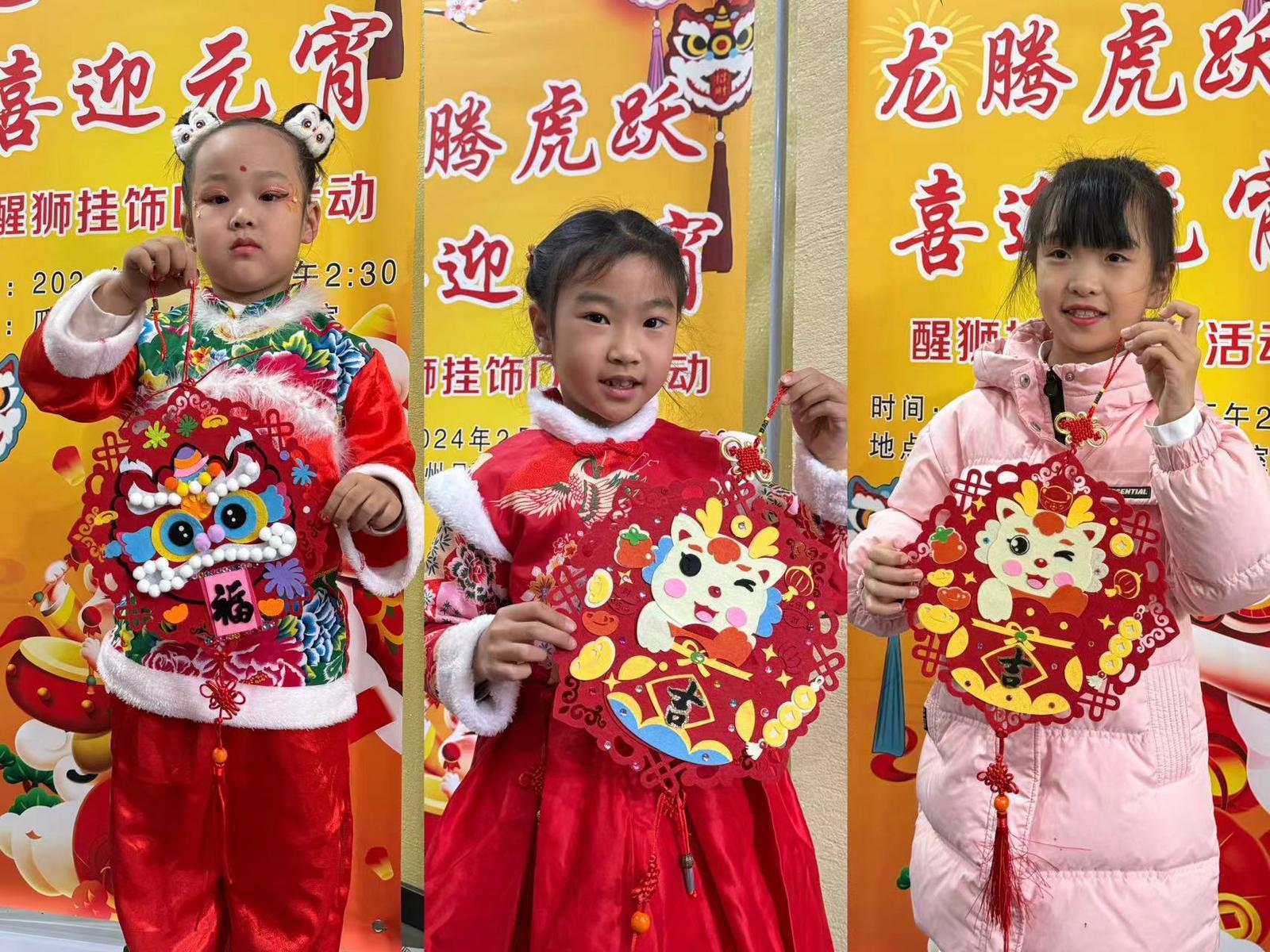 “这里还需要一个黑色的打底。”“你这里少贴了一个装饰。”在互相交流、互帮互助的过程中,一个个喜庆的新春醒狮福字挂件精彩亮相。孩子们看着自己的作品,脸上洋溢着幸福的笑容,纷纷拍照留念,高兴地展示自己的制作成果。
