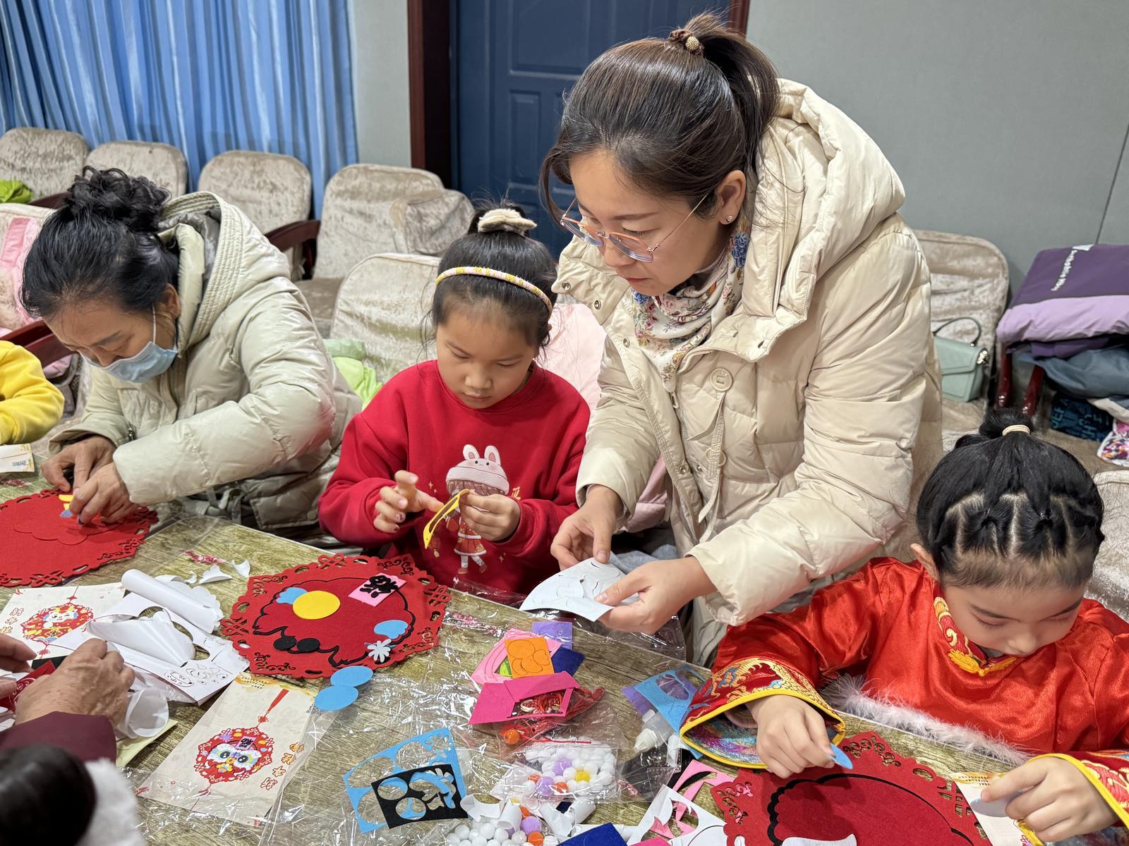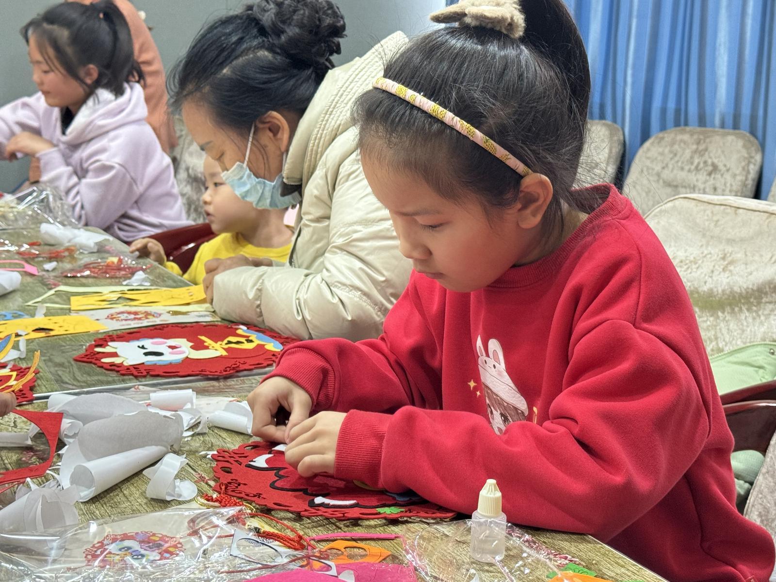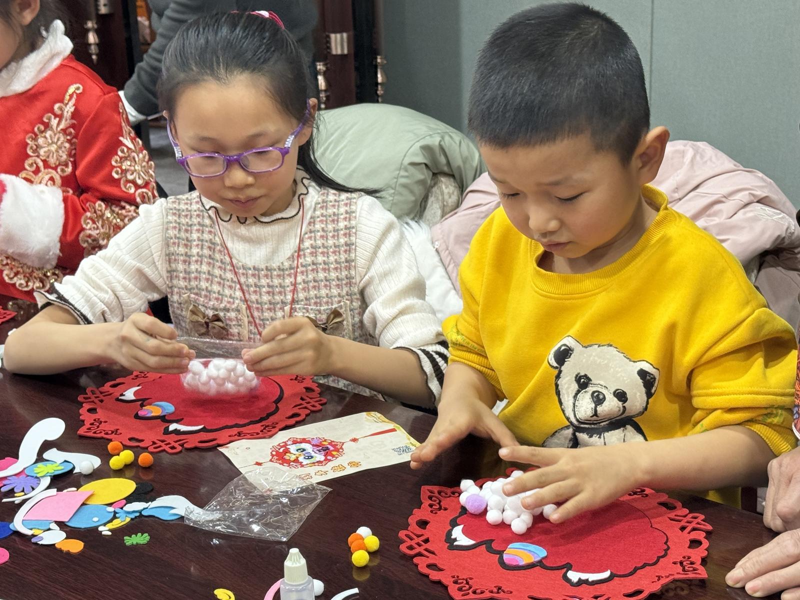 “这里还需要一个黑色的打底。”“你这里少贴了一个装饰。”在互相交流、互帮互助的过程中,一个个喜庆的新春醒狮福字挂件精彩亮相。孩子们看着自己的作品,脸上洋溢着幸福的笑容,纷纷拍照留念,高兴地展示自己的制作成果。
