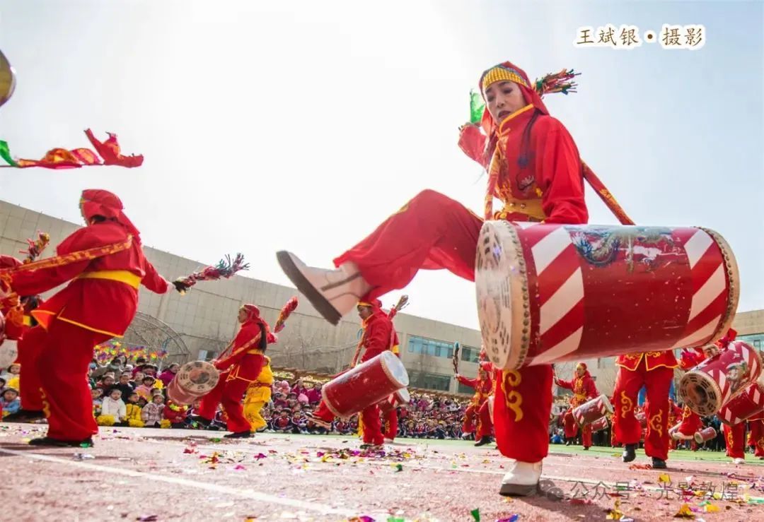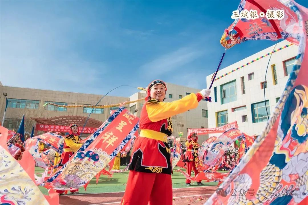 社火队演出人员们身着节日盛装,伴着激昂的鼓点、翩飞的彩扇,一路踏歌而来,让观看的师生们深切感受到了民俗文化的独特魅力。