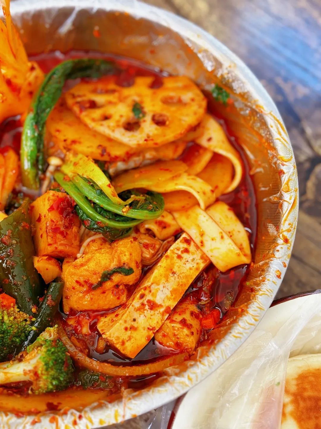 除此之外,酥松多孔的面筋、豆泡,携着足量的红油在口中爆炸;圆圆的素鸡卷,裹满辣子的整根鸡肉肠,吃起来都比肉还香……虽然甘肃麻辣烫里由素菜主导,但舌尖仍然能获得无上的满足感。