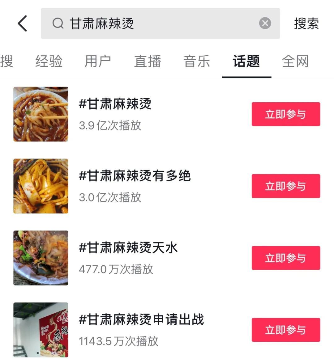 在短视频平台,以天水为代表的“甘肃麻辣烫”,相关话题达到上百个。在抖音短视频平台“天水麻辣烫”“甘肃麻辣烫”持续上分,仅近一周400多个网络美食达人,更新相关作品超500个,以每天超2000万播放量的趋势狂飙。