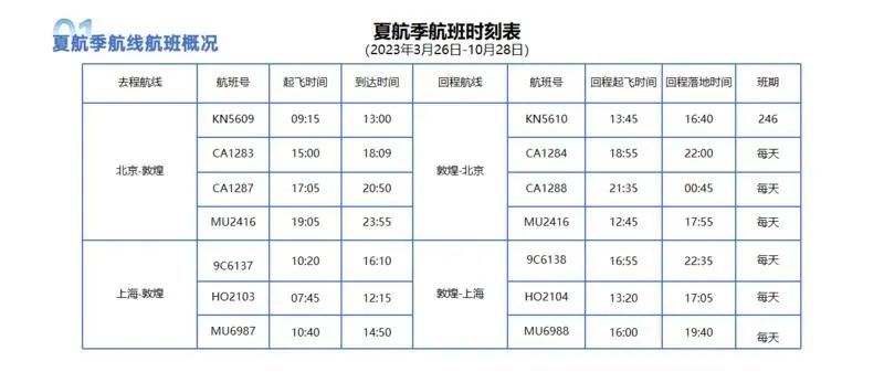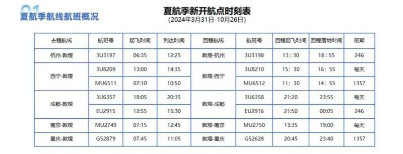换季后,加强与京津冀、粤港澳大湾区、成渝等地的航空联系。敦煌机场将继续执飞通往北京、上海、杭州、成都、重庆等热门城市的航班,新增深圳、福州等地航班。其中敦煌至北京航班每天最高可达4班,敦煌至上海航班每天3班、敦煌至深圳、成都、南京、合肥、昆明、长沙等城市每天至少1班,为旅客出行提供更多更便利的选择。