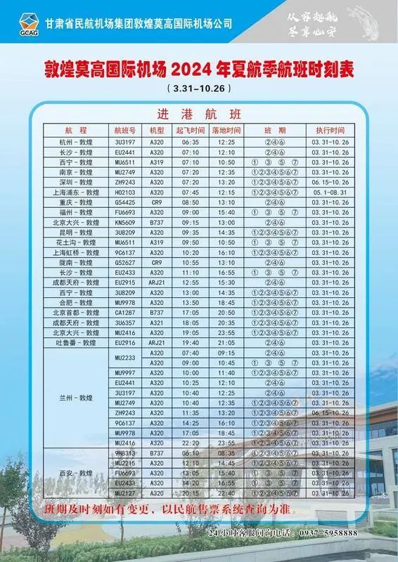 记者了解到,3月31日起,敦煌莫高国际机场开始执行2024年夏航季航班时刻。换季后,共计划执行客运航线22条,其中国内航线21条,国际(地区)航线1条,为旅客出行提供更多便利和选择。