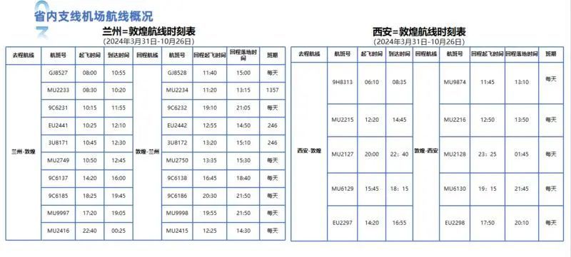 换季后,高标准打造“兰敦、西敦”航班快线。敦煌至兰州航班每日最高可达9班以上,以“每2小时1班”为目标持续优化航班结构,“兰州=敦煌”快线已构建完成;敦煌至西安快线每日可达5班以上。逐步形成直达航线与经停兰州、经停西安中转联程航线相配合、连接北京、上海、广州等100余座城市的航线网络。