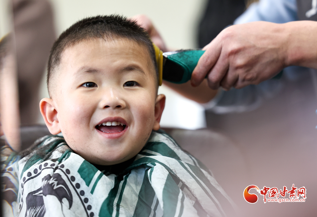 3月11日,在临夏市一理发店内,理发师正在为一名小朋友“剃龙头”。当日,是农历二月初二,许多家长带着孩子到理发店理发,希望孩子能健康成长,日后出人头地,为新的一年讨个好彩头。