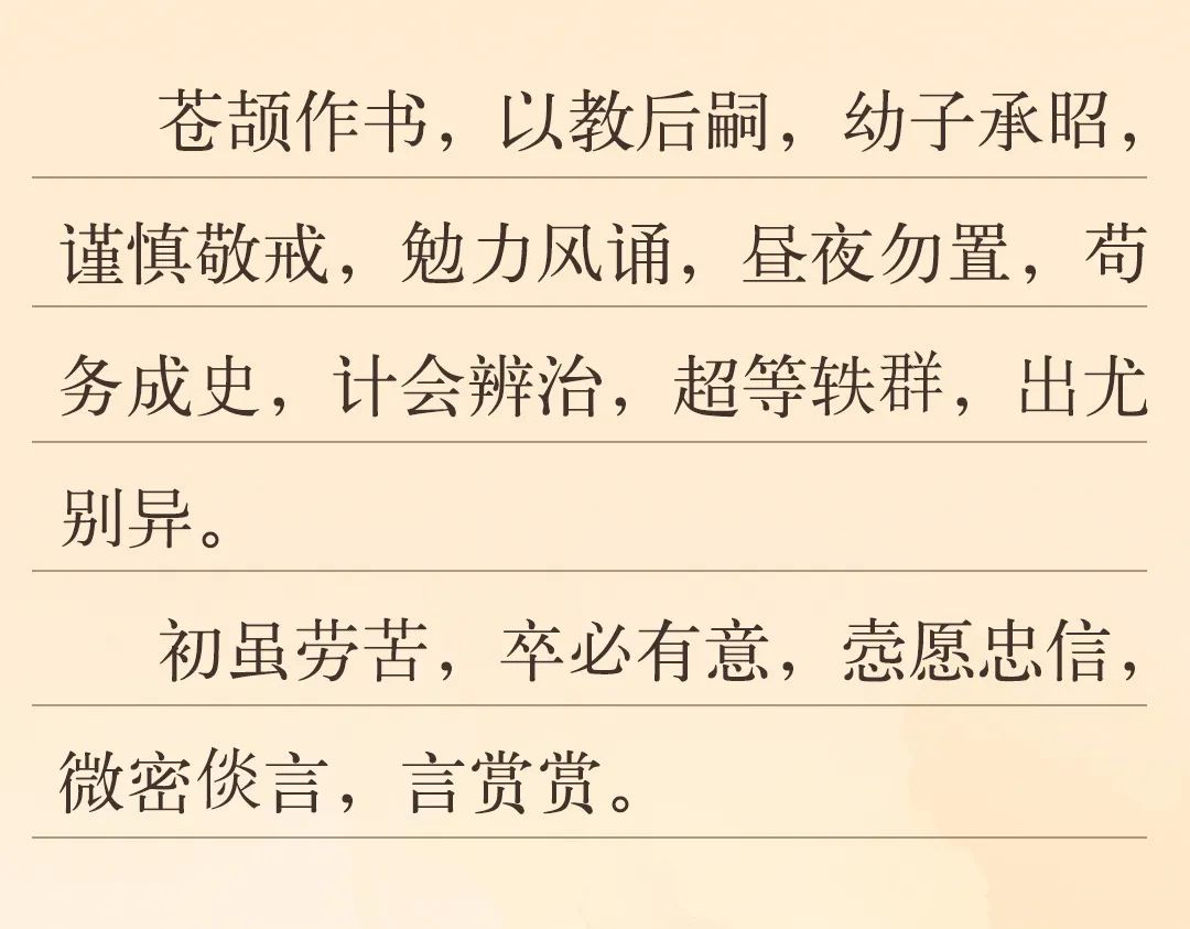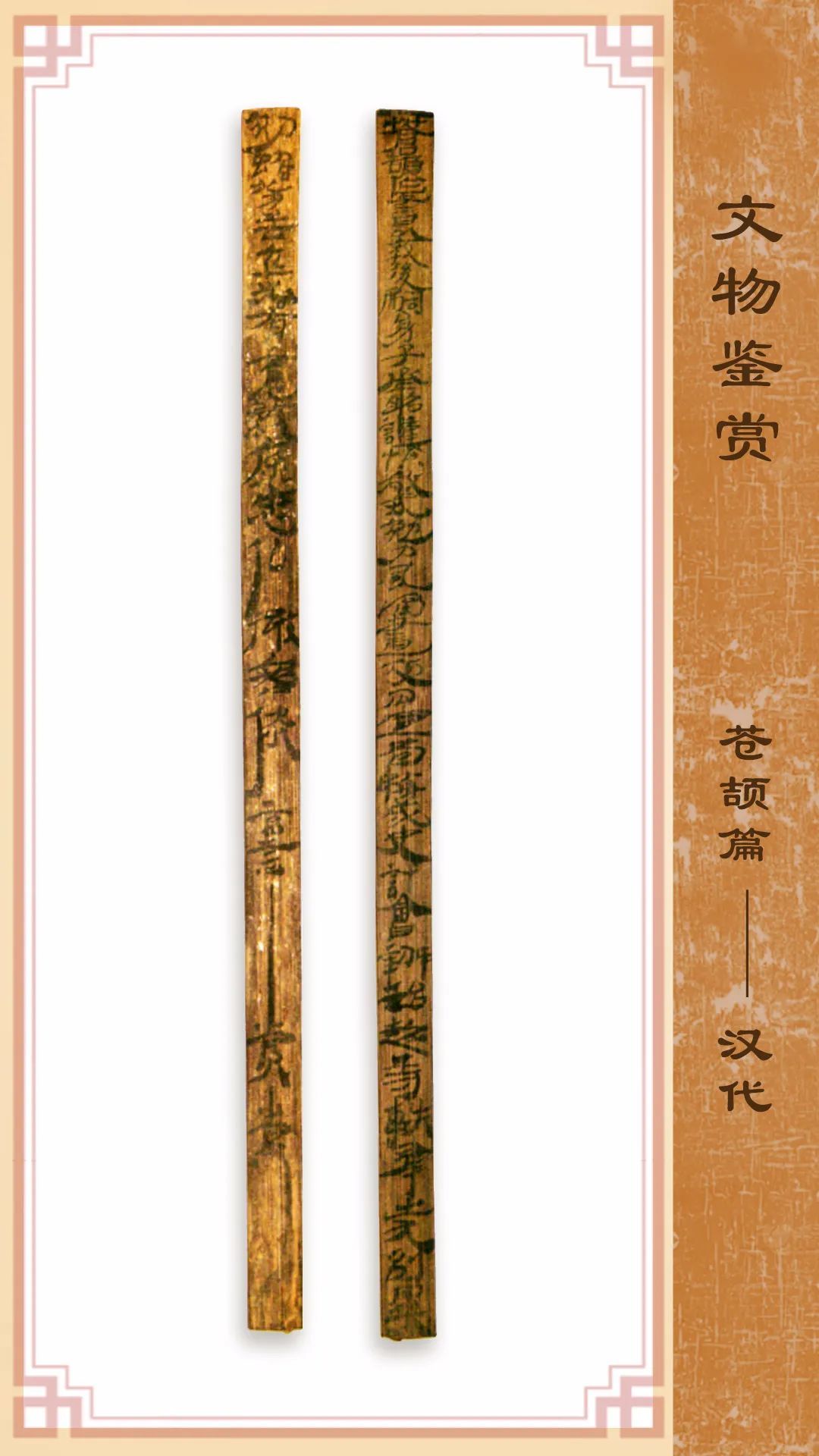 根据《汉书•艺文志》记载,汉兴以后,闾里乡师(地方乡里教书先生)将秦时的《苍颉》《爰历》《博学》三篇合为一篇,习称汉《苍颉篇》。根据传世文献和出土资料可以大致知道,汉《苍颉篇》共五十五章,每章十五句,四字一句,共计应为三千三百字。