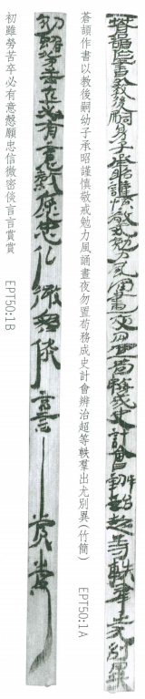 此为《苍颉篇》第一章残文。1974年出土于居延甲渠候官遗址。竹简1枚,简文共59字,正反两面书写。该简是目前河西汉简中所见最为完整的《苍颉》篇首章部分文句。此简应该是官员在闲暇之时练习默写所用,简末二字“赏赏”可能是习字者随意所书。