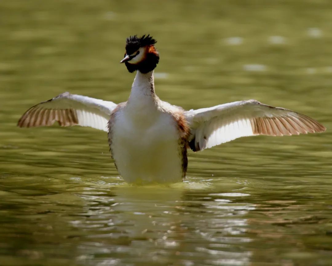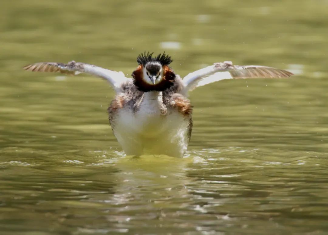 在国际爱鸟日到来之际,国家二级保护动物凤头鸊鷉(音pì tī)现身平凉柳湖。