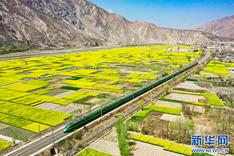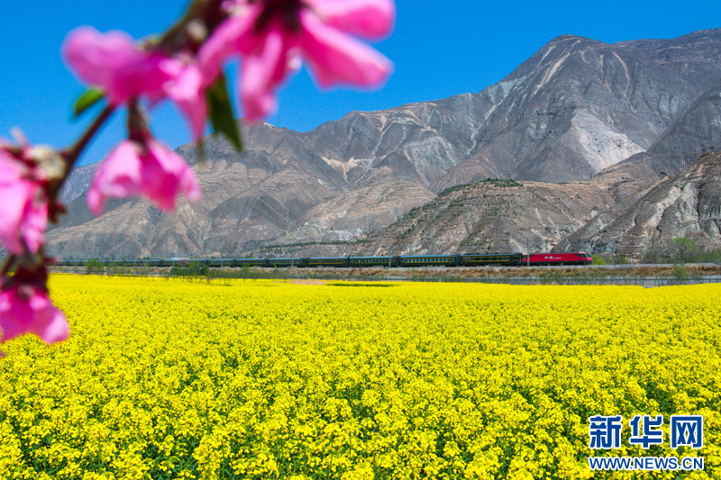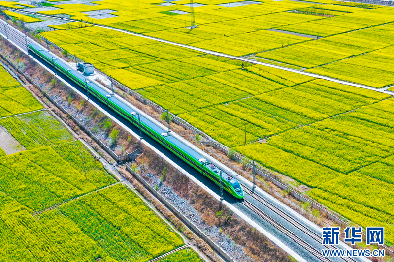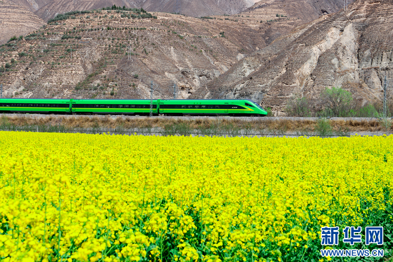 在甘肃省陇南市的白龙江畔,油菜花沿江绽放,满目金黄。飞驰在兰渝铁路线上的列车穿行于花海间,奔赴一场春日浪漫。(拍摄:王光辉 视频:南佳敏 刘欣瑜)