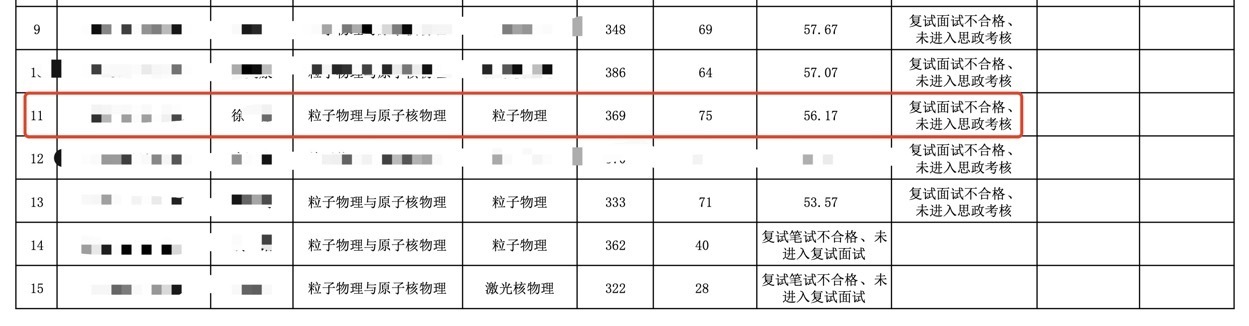 南京大学物理学院官网4月2日发布的《2024年硕士研究生招生考试复试成绩及总成绩》显示,该男子初试复试总分506.78分,备注为“复试不合格”;而此前学院公布的复试名单显示,该男子考研初试总分为369,在粒子与原子核物理专业排名第一。