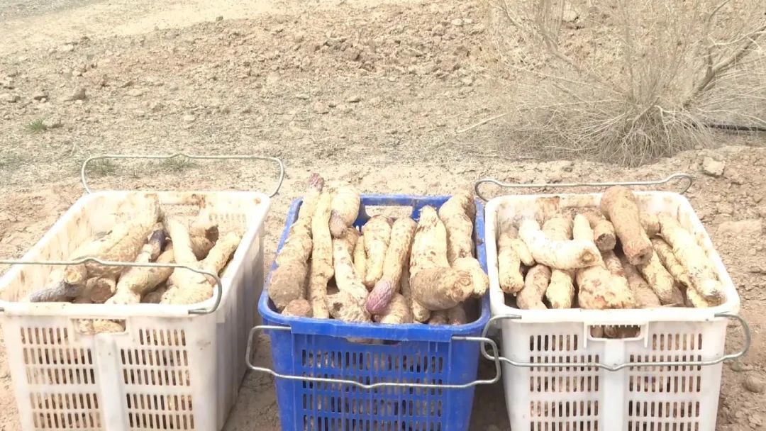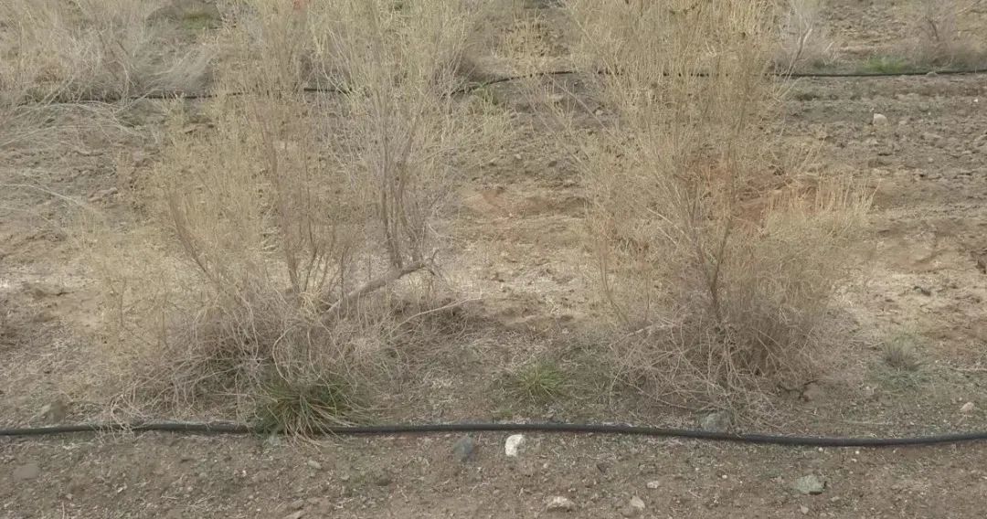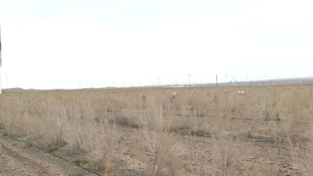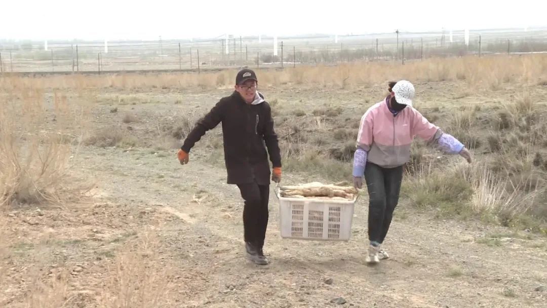 “政府投资了滴灌水池子,把水浇上,今年的这个苁蓉我看得要比去年好呢,平均每亩能产两百公斤,有三千多亩地,估计能收60吨左右。”