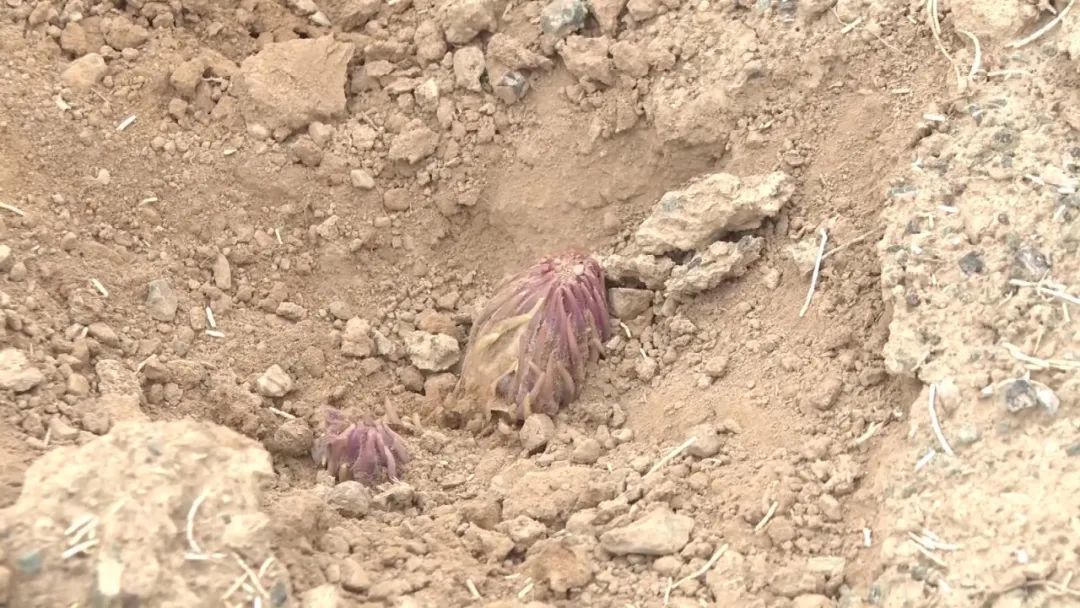 “我们顺着梭梭树的边寻找鼓起来的包,找到剥开有紫颜色的头,我们就开始挖了。”