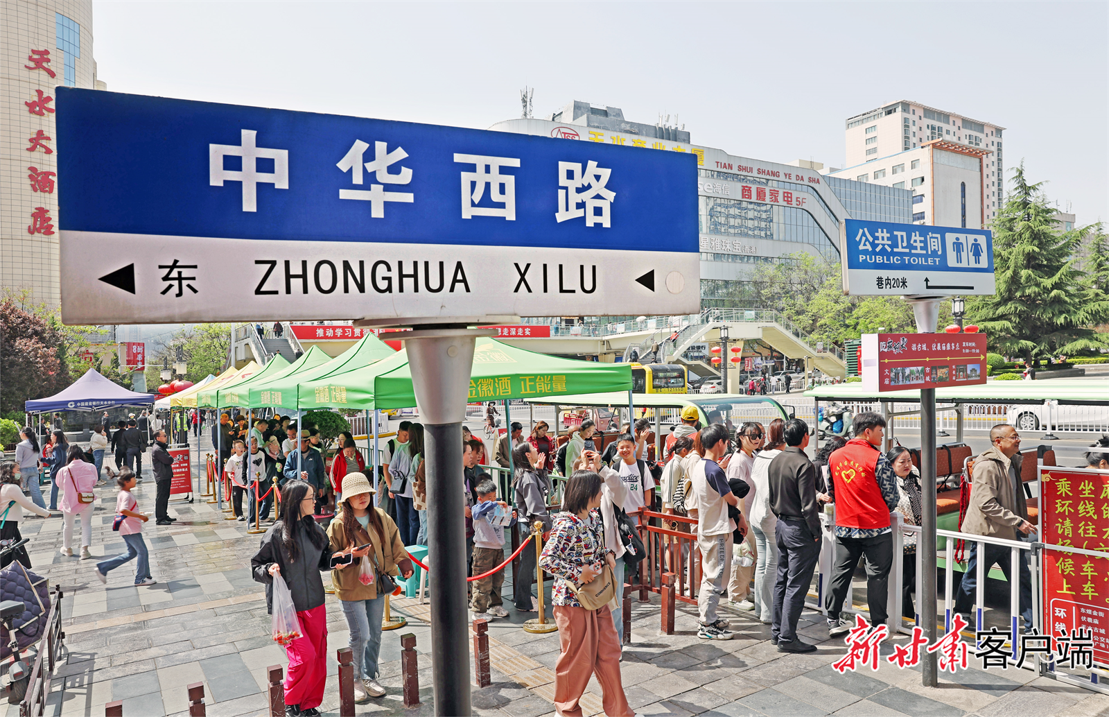 在天水中华西路步行街游客免费观光车接送点,前来吃麻辣烫的游客排起了长长的队伍,等待工作人员引导。