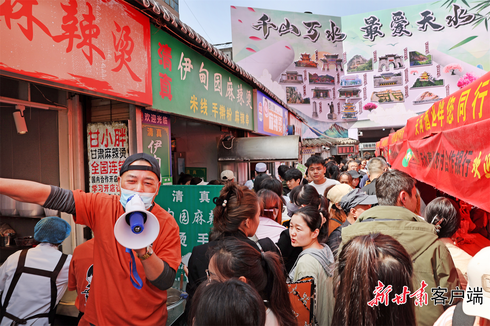 4月13日午饭时间,天水古城一家新开的麻辣烫店摆着十几张桌子,有人在大快朵颐,有人在排队等候,好不热闹。