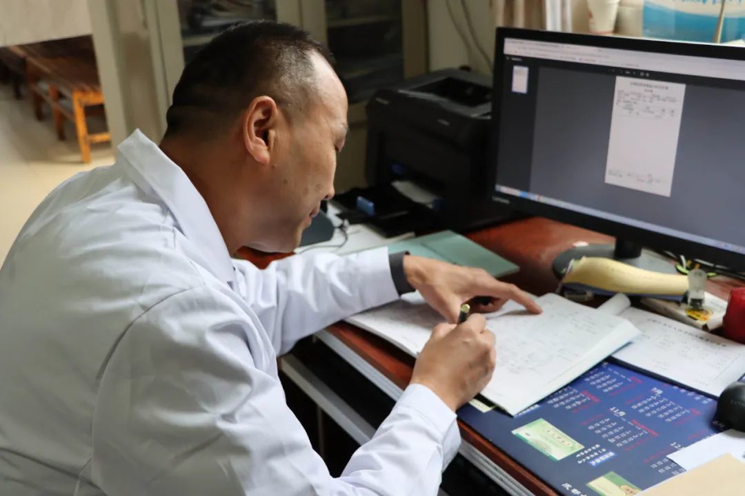 从医三十余载,不论白天黑夜、寒冬酷暑、晴天雨天,王鸣飞24小时随时待命,365天在岗,只要有需要,他总是义不容辞,随叫随到。他的足迹遍布村里的每一个角落,他那厚厚的笔记本上记载着每一个村民的健康情况。金山村有老年人168人,高血压患者174人,糖尿病患者26人,严重精神障碍患者5人……1200多位村民的健康信息,不仅记录在健康档案里,更记在王鸣飞的心中。