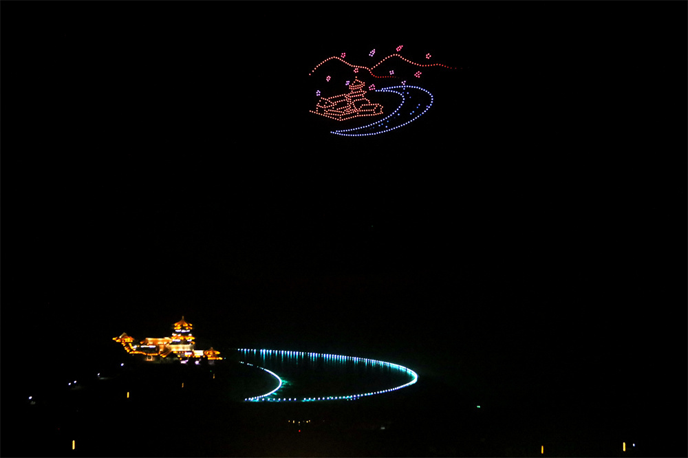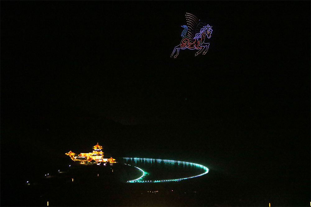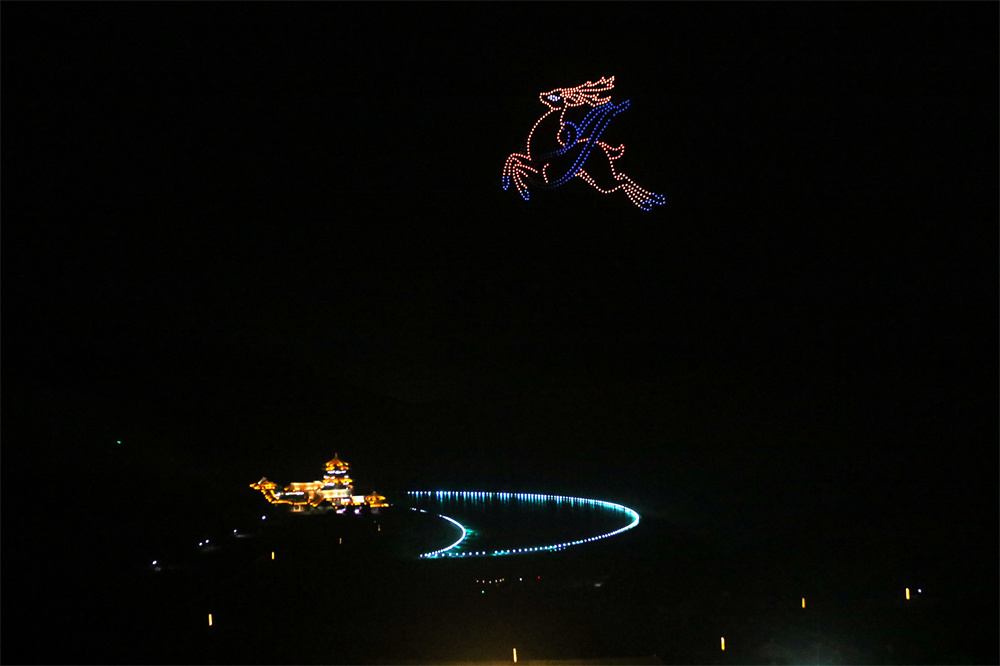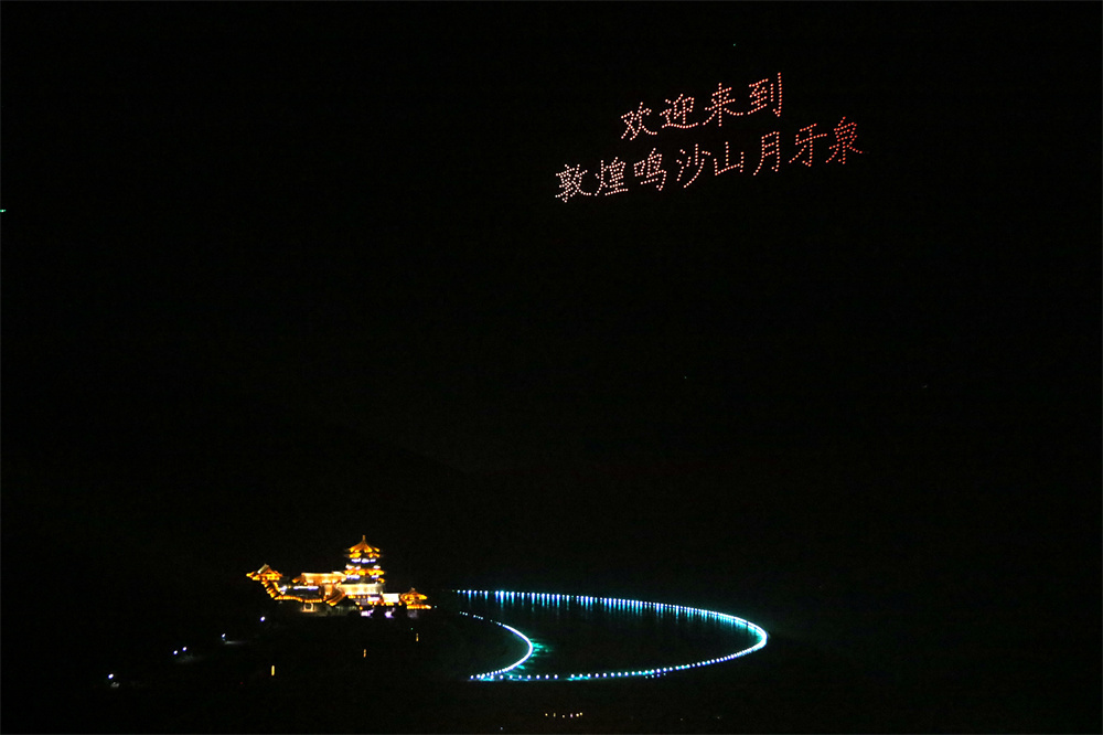 原标题:敦煌:鸣沙山月牙泉景区夜空上演无人机灯光秀