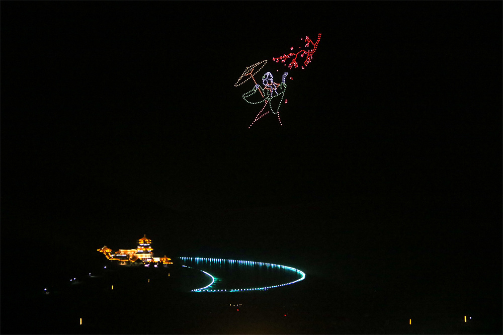 4月15日晚,敦煌市鸣沙山月牙泉景区夜空上演了一场以“春到敦煌”为主题的精彩无人机灯光秀。现场描绘出了飞天、九色鹿、骆驼、鸣沙山、月牙泉等敦煌元素的画面,闪耀夜空,绚丽多彩,与鸣沙山月牙泉交相辉映,美丽迷人,给游客带来一场科技感与艺术感十足的视觉文化盛宴。