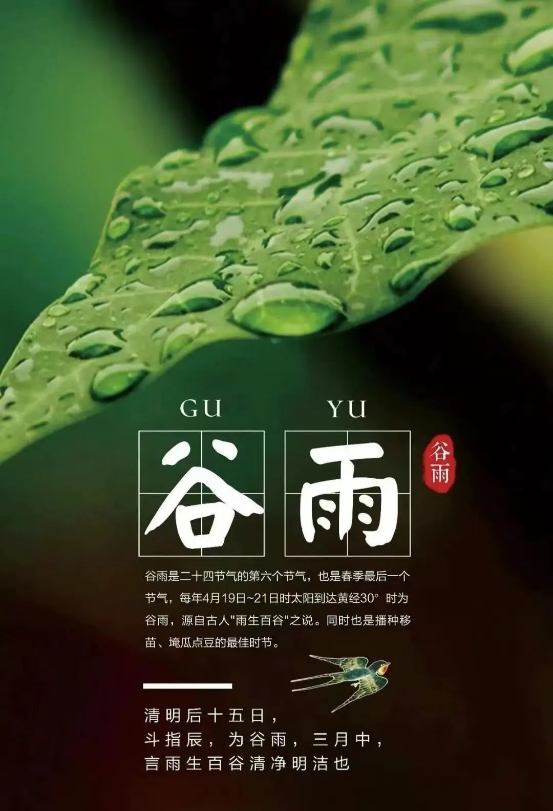 “正好清明连谷雨”。《群芳谱》云:谷雨,谷得雨而生也。秧苗初插,作物新种。一年弹指春又归,谷雨,便最后一次回眸春天。“东风莫扫榆钱去,为买残春更少留。”谷雨,将人间的春色尽情释放。夏天就要醒了,谷雨,把春天的尾巴甩了又甩。若落一场雨,便会情深意长,在杨花柳絮的诗韵中,沏一杯新茶,就床吹落的那几页书,便更为人间值得。