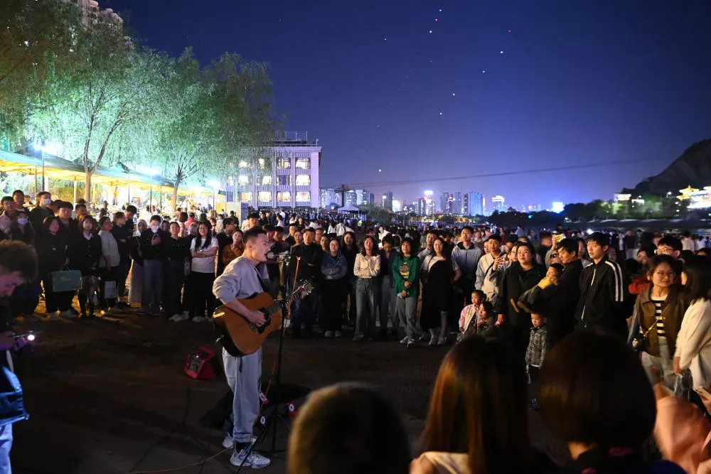 夜幕下,兰州百年铁桥霓虹闪烁,滔滔黄河流光溢彩,沿岸传来淳厚的民谣与雄浑的合唱,交织成动人的旋律,这场在黄河畔举行路边演唱会,浪漫的氛围吸引了很多人前来打卡。