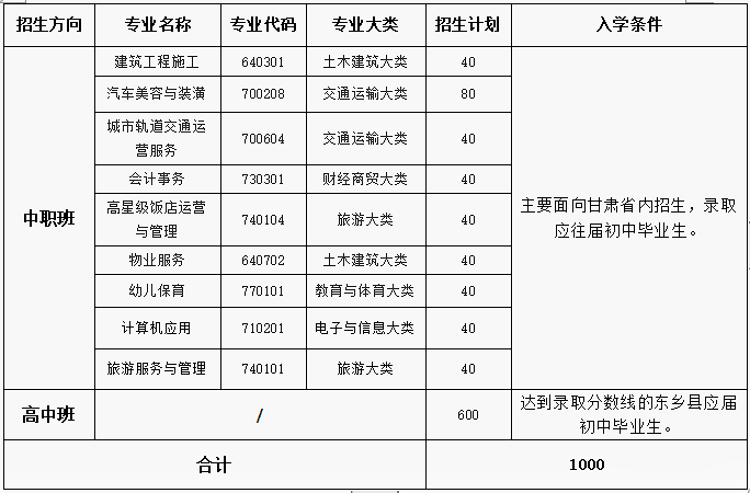 1.本校中职班主要面向甘肃省内招生,录取应往届初中毕业生。