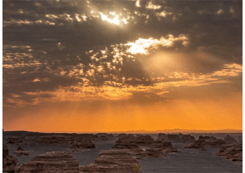在落日的映照下,阳关古烽燧下的戈壁滩显得更苍茫而辽阔,落日的余晖把大漠戈壁上空的晚霞染成一片金黄。让人产生无限遐想,看大漠的一圆落日,想让时间在此刻静止。来敦煌吧,感受“阳关古道,落日长河”的苍茫暮色。