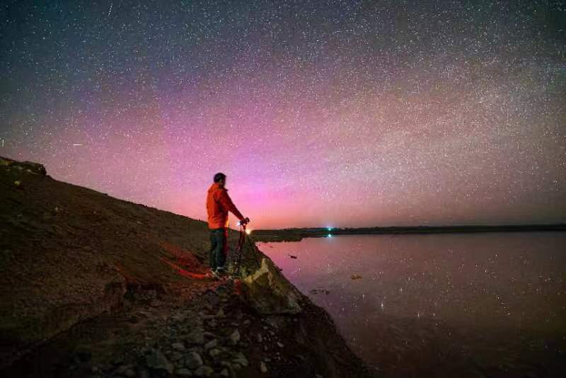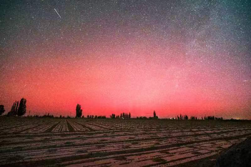 受日冕物质抛射的影响,5月11日凌晨2时14分左右,敦煌市区以北方向出现罕见的红色极光,极光似柔软细腻的红色丝绒,悄无声息地轻裹住浩瀚的星空,伴随划过长空的颗颗流星,如梦似幻。