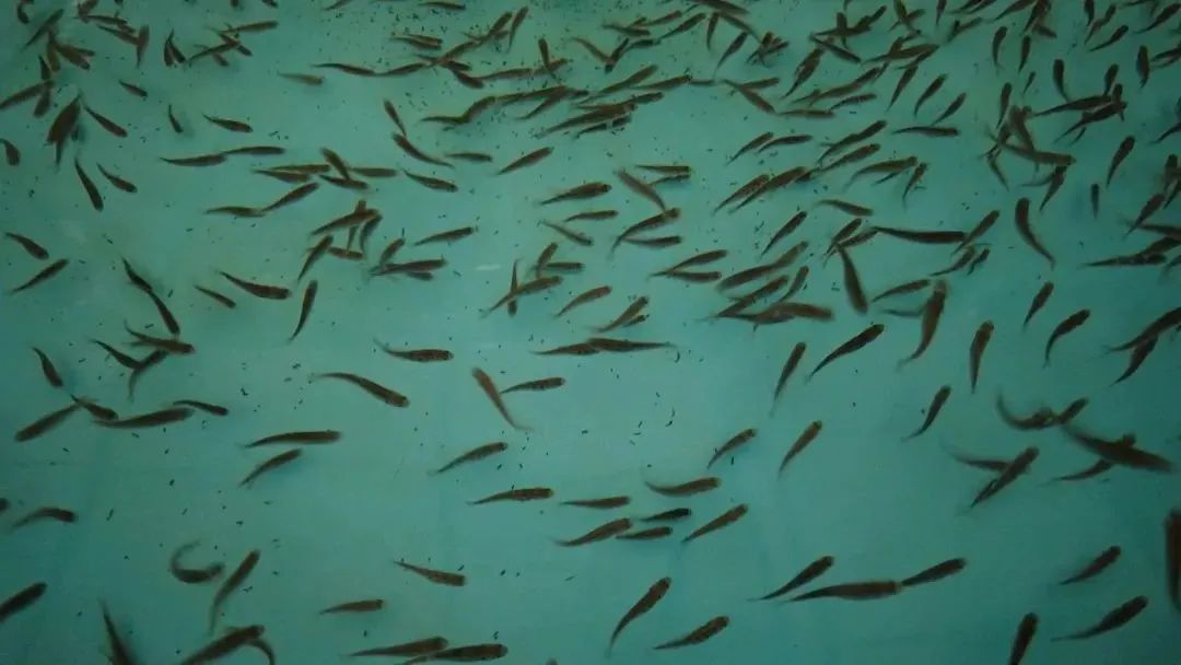 走进景泰鲟龙渔业有限公司冷水鱼苗培育车间,鱼苗孵化桶和育苗实验池整齐排列,一尾尾鱼苗活蹦乱跳顺着水流快速游动。