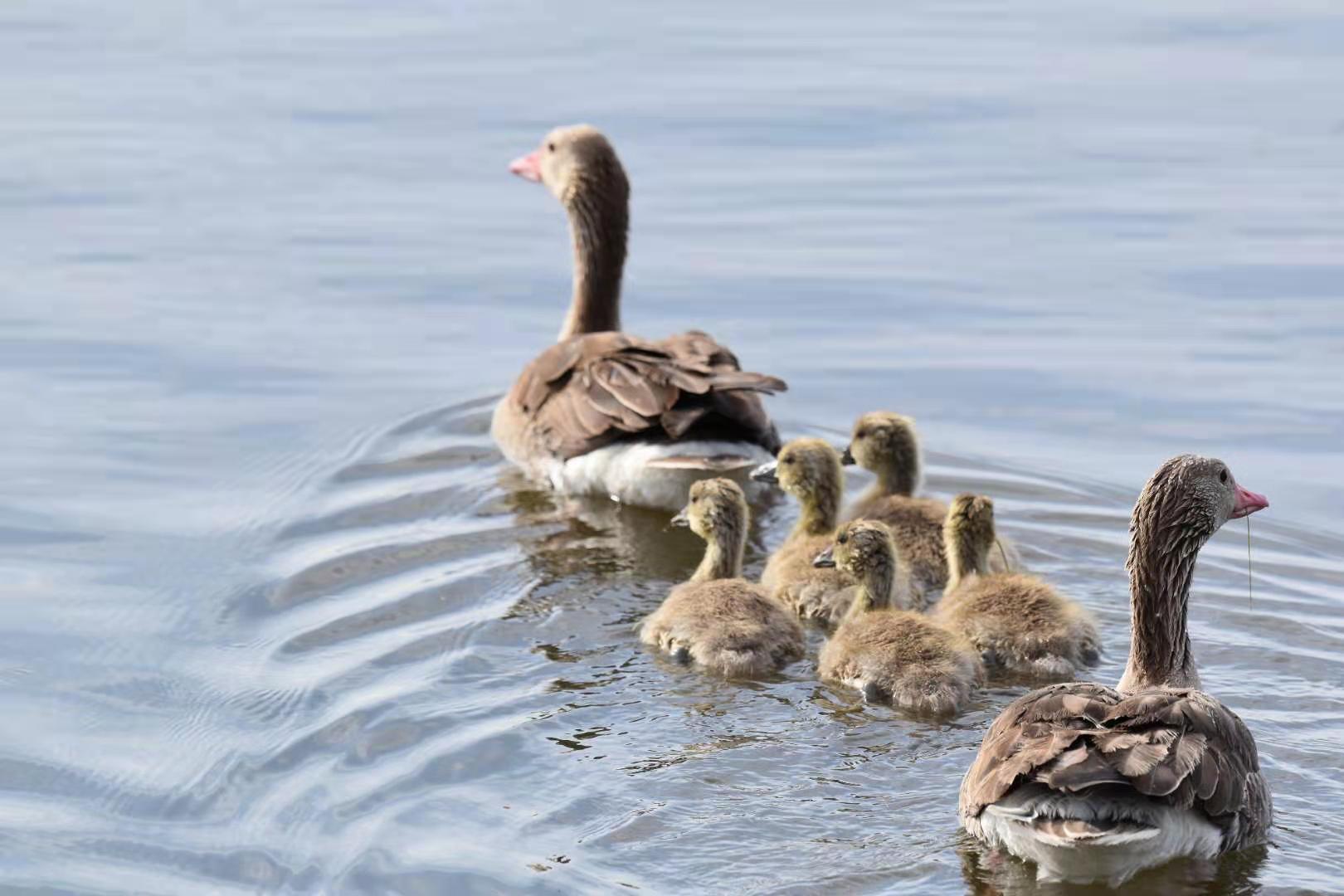 灰雁是鸭科雁属鸟类,属国家重点保护的“三有”鸟类,也是阳关湿地的夏候鸟。监测显示,在阳关湿地繁殖的灰雁家族有100多只。每年3月下旬迁飞至阳关湿地,4月中旬筑巢繁殖,5月上旬孵化出雏鸟4至5只。