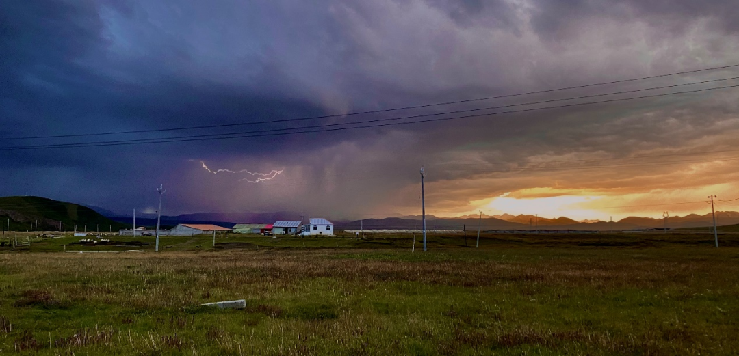 蔚蓝而没有一丝斑驳的天空中,夕阳西斜,这是一天中阳光最柔和的时分。柔和的光芒轻抚着这里的每一座山峦,每一头牛羊,每一株草木,伸出双手感受自然的温暖与柔和。刻钟时间,便化作天边火热的霞,让人不禁感叹余晖的美艳与时光的流逝。忽然一阵冷风席卷,天边一片乌云袭来,落日余晖与雷鸣暴雨出现在同一个时空中,一端凶猛冰冷,一端温暖柔和,组合成青藏高原上的壮丽奇景。雨雾过后天空恢复清明,蓝黑色的天幕闪动着点点星光,一切都归于平静,伴随着稀薄的空气,能静听到来自高原的绕梁幽歌。