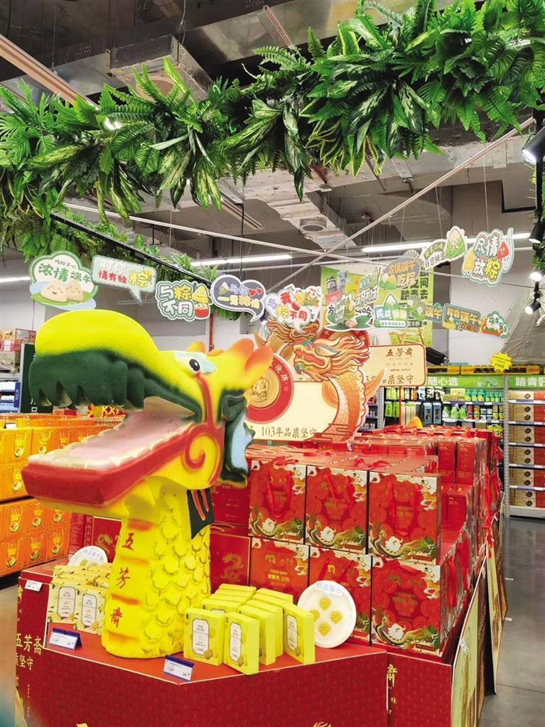 走进雁滩大润发超市,以龙舟装扮的端午粽销售区与往年相比,进驻品牌略有减少。“这款138元的粽子是目前销量最好的,因为价格更亲民,所以购买的市民比较多。”超市工作人员介绍,今年该品牌粽子价格不仅整体下调,凡购买还可赠送碗或汤圆两袋。