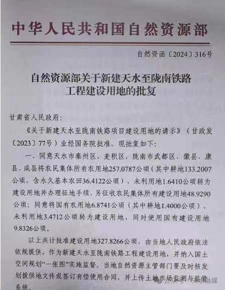 天陇铁路途经天水市麦积区、秦州区及陇南市徽县、成县、康县、武都区六县(区),沿线自然保护区、文物、矿产资源等数量众多 。用地报批涉及前期资料多,工作量大、时间紧、任务重。用地报批工作开展以来,天陇公司多次协调市、县(区)自然资源部门召开用地报批工作推进会议,及时发现工作中存在的问题,全力协调落实解决。经过不懈努力,于近期顺利取得天陇铁路建设用地批复文件。此次用地批复文件顺利取得,对项目建设进度起到了实质性推进作用。