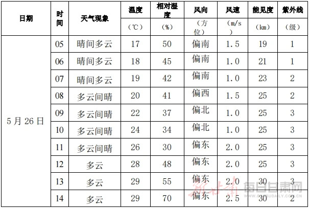 26日,受波动气流影响,天气多云间晴,马拉松比赛期间(07~14 时),气温17~29℃,平均风速2~3m/s,阵风4~6m/s,相对湿度40~60%,能见度20~30km。