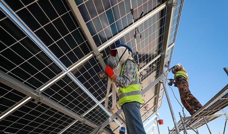 夏日的金塔,满目葱茏。走进金塔县白水泉光电产业园的酒钢白水泉二期400兆瓦光伏发电项目建设现场,施工人员正抢抓项目建设进度,安装支架、安装光伏板组件,一派大干快上的忙碌景象。