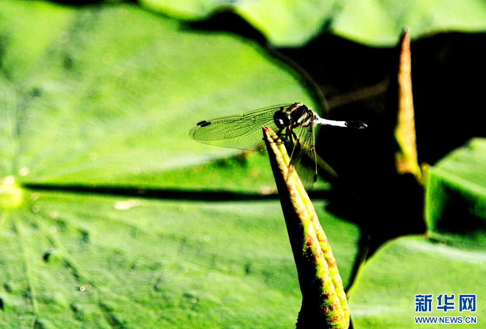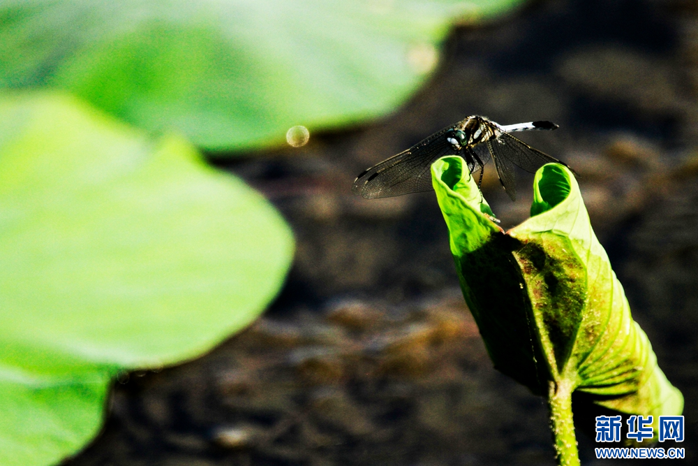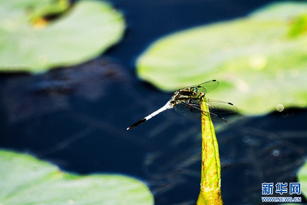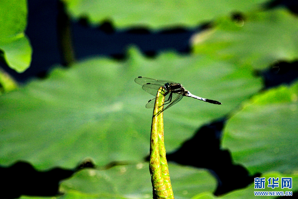 夏日里,甘肃省张掖国家湿地公园荷塘中荷叶初生,叶片卷曲合拢,顶端尖而细长,引来蜻蜓休憩,构成了一幅充满诗情画意的美丽图景。新华网发(陈礼 摄)