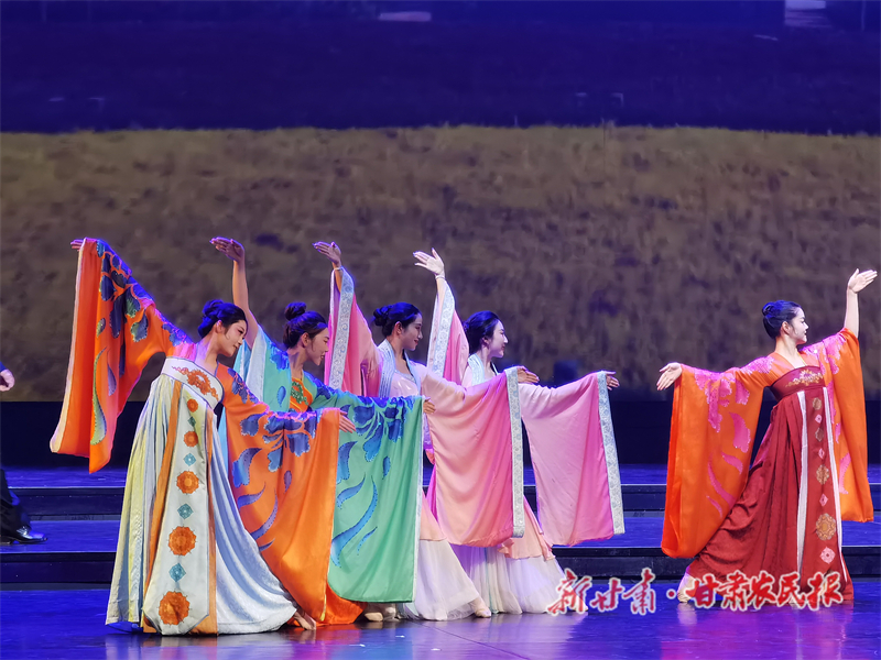 伴随曼妙的音乐,身着古装服饰的舞者们翩翩起舞,尽情演绎西凉乐舞的艺术魅力和凉州宫廷的繁华。