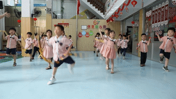 庄恩琪(前)在幼儿园练习跳英歌舞