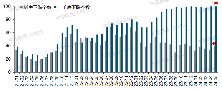 新房市场而言,5月,百城新建住宅价格环比下跌城市数量为40个,较4月增加6个。具体来看,中山新建住宅价格环比下跌0.36%;昆明、西宁等12个城市新建住宅价格环比跌幅均在0.1%(含)-0.3%之间;漳州、武汉等27个城市跌幅在0.1%以内。
