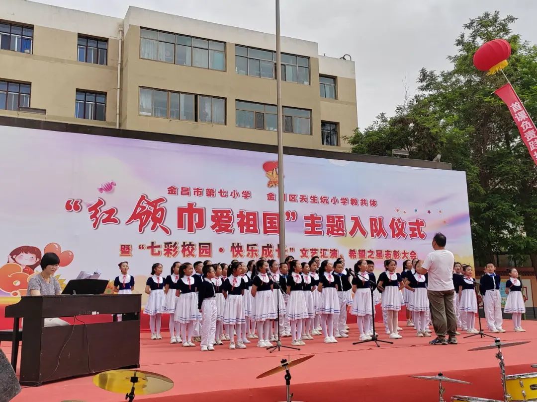 金昌市第七小学教共体举行了少先队入队授巾仪式,同学们高唱《中国少年先锋队队歌》,表达对少先队组织的热爱之情。在“七彩校园·快乐成长”文艺汇演中,孩子们用自己独特的方式抒发着对幸福生活的美好向往。